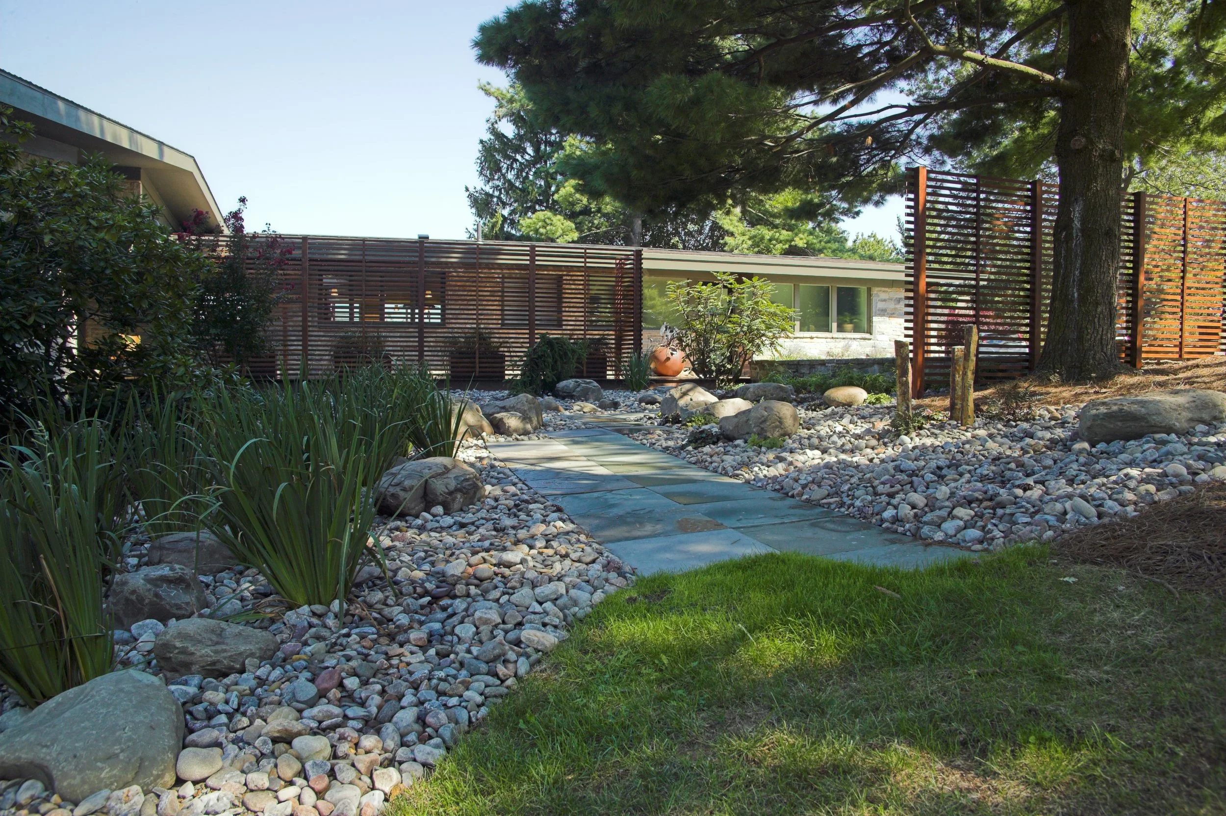 A new garage addition was carefully positioned to define a private backyard living area. This placement not only enhances functionality but also creates a harmonious flow between indoor and outdoor areas.